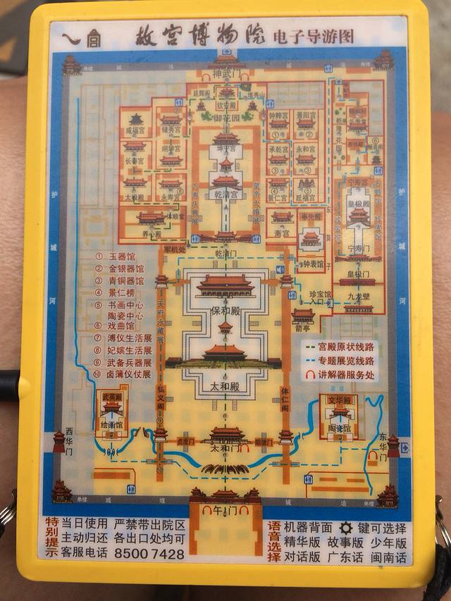 我们人手购置一台20元的电子导游机,每到一个大殿景点它会自动播音介绍,超多声控版本,闽南话粤语英语面面俱到。但并不是一样你能带回家纪念的东西,在你出故宫前,一定要记得归还出口处的回收处。