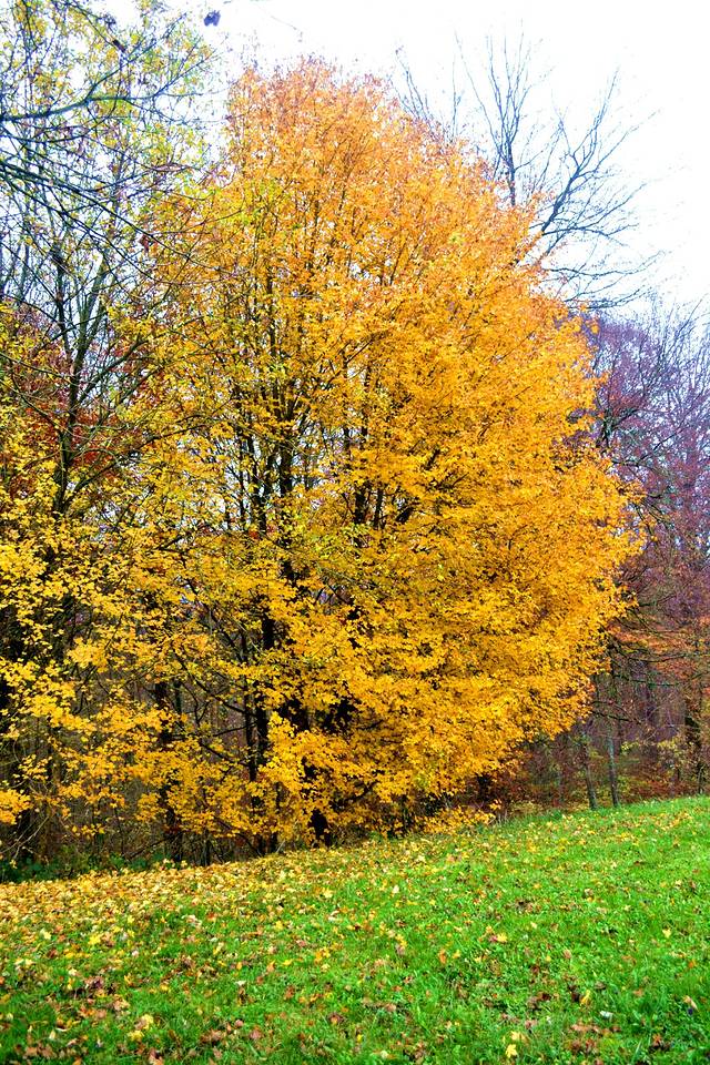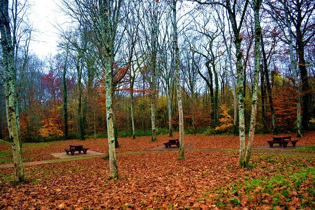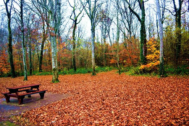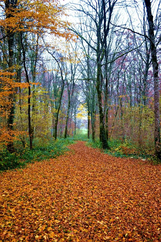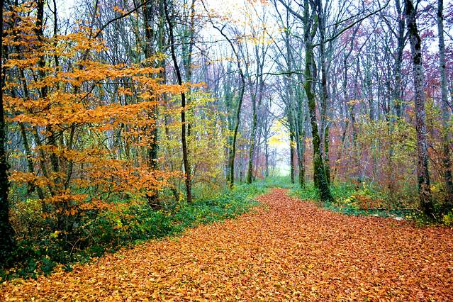 秋天的森林里,地上铺着一层厚厚的树叶。枯黄的树叶,也别有风味。