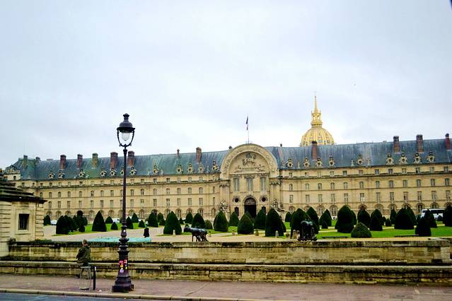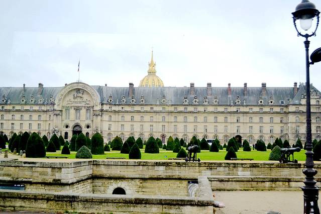 上面照片是荣军院。长长的一排荣军院背后是金色的园顶大教堂。拿破仑皇帝的遗骸位于荣军院的圆顶教堂正下方的红色斑岩石棺里,安放在绿色的花岗岩基座之上。石棺内有5个棺材,一个套着一个。陵墓上方是庄严肃穆的教堂圆顶。1989年修复教堂时,使用了55.5万片金箔,总重量达12.65千克。周围环廊墙壁上刻有12幅胜利女神的浮雕画,每幅雕像代表一场光辉的战役。