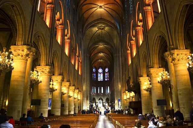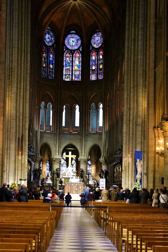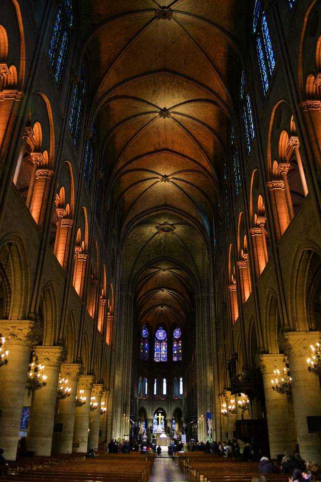 教堂底层一进门便能看见绚丽夺目的3个玫瑰画窗,左手边是耶稣受难像,向里走则是祭坛,在祭坛后面是一个巨大的管风琴。参观教堂是免费的,如果想要上钟楼,需要出教堂,在教堂的北侧排队。从教堂的北侧进入,到达二楼先买票,北侧的二楼大厅与底楼的管风琴廊台同高,这里建有八等分的尖形拱顶。在大厅的尽头,是一个完全镂空的塔楼,建有一个设计精湛的螺旋形楼梯。沿着楼梯向上走,在顶楼距离地面46米处有一个奇幻怪物走廊,这条走廊之所以出名,是因为栏杆转角处饰有许多怪物雕像。这些由设计师奇想出来的鸟兽、杂交动物与传说中的怪兽,三三两两栖息在教堂钟楼之上。其中最出名的雕像便是思提志(Stryge),它若有所思的望着巴黎,津津有味的坐观尘世的物换星移。走廊上的雕饰随处可见花饰、动物形檐口排水雕饰、鬼怪头像与卷叶饰。这条由小圆柱支撑的奇幻怪物走廊展示出拱廊与各种雕饰的精美。沿着奇幻怪物走廊从北侧钟楼来到南侧钟楼,这里安置着教堂中最大的钟。这座大钟铸造于十七世纪,重13吨,它只在重大的天主教节日中敲响。每天数次被敲响的则是安置在北侧钟楼内的另外四座大钟。沿着南侧钟楼的阶梯可以继续向上,来到南侧钟楼的楼顶。站在楼顶远眺,塞纳河 的景色一览无遗,偌大的巴黎就在眼前。西侧可见西岱岛上的圣礼拜堂、慈善医院与司法宫,远一点则是卢浮宫 与凯旋门 ;北侧可见圣雅克塔与蒙马特山丘上的圣心教堂 ;东侧可见圣路易岛与国立图书馆;南侧可见塞纳河左岸栉比鳞次的屋舍,它们是拉丁区最古老的建筑。参观完后沿着教堂南侧的楼梯下至底层,然后从教堂前面一个不惹眼的楼梯就可以进入地下室。地下室内收藏了从罗马时代开始的这个城市的遗迹和一些艺术藏品,参观完地下室则可以让你对圣母院的了解更为丰富。