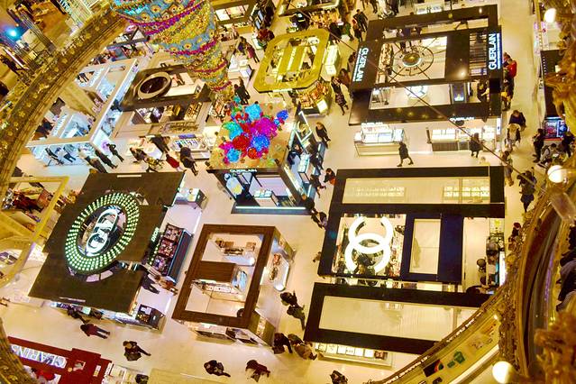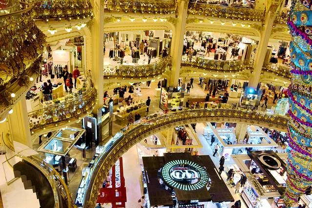 老佛爷百货全称巴黎老佛爷百货商店,它诞生于1893年,占据了奥斯曼大道的40号,紧邻巴黎歌剧院。它曾经凭借豪华如宫殿的装修轰动一时。在拜占庭式的巨型镂金雕花圆顶下,来往的人影绰约,像赴一场中世纪的聚会,购物真正成了一种享受。老佛爷百货的另一个招数是特别重视小顾客,为将来的顾客群打下基础。每年圣诞来临之前,老佛爷都会针对孩子设计一个童话故事主题,这已经成为老佛爷百货公司最突出的"特色"。比如橱窗主题,就讲述了虚构童话人物伯朗蒂小公主的一天,伯朗蒂小公主是一个现代的公主,她和大家一样生活在现代的世界里,她心爱的小熊楚菲陪伴着她到处游走。在11个圣诞橱窗里,老佛爷百货用各种电动道具和玩具,展示了伯朗蒂小公主11个生活片段。