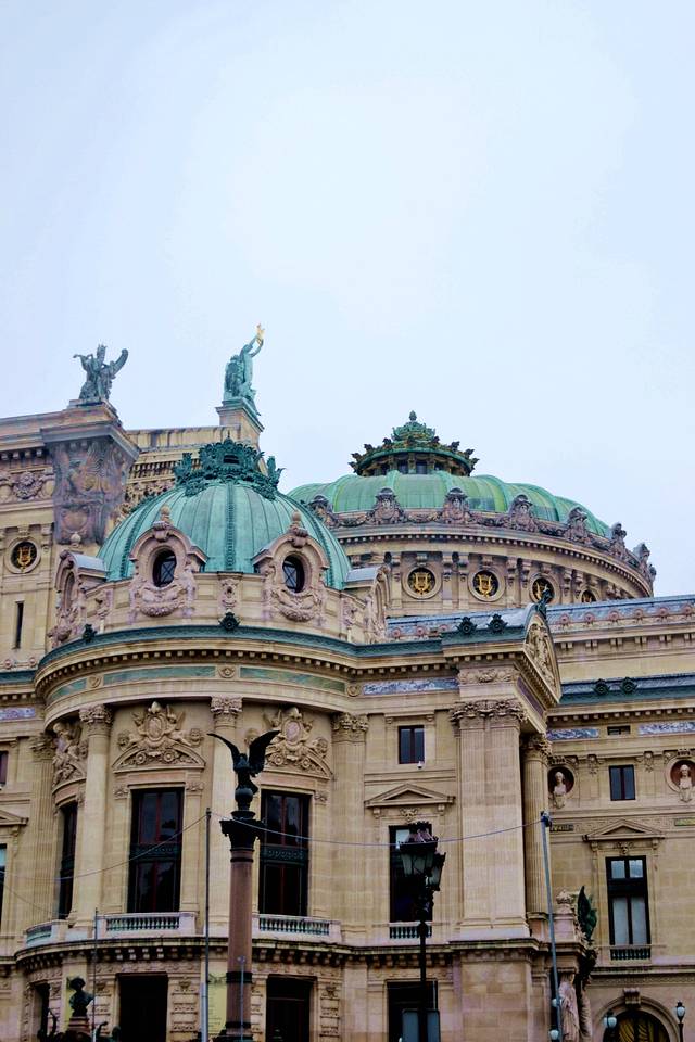 来到歌剧院前,会看到这栋建筑的外观上全是精美的雕刻,从白色的外墙、拱门、石柱到绿色的大顶和金色的两端,各种雕像、花纹,极其华丽。巴黎歌剧院还象征着拿破仑三世和欧也妮皇后的爱情,建筑正面顶部刻着的N和E就是证明。