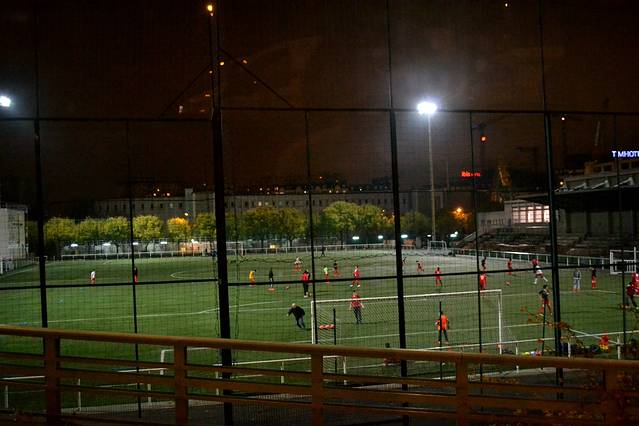 由于明天早上要回国所以今天就早些回到酒店。路上看见小学生在灯光球场里踢足球。