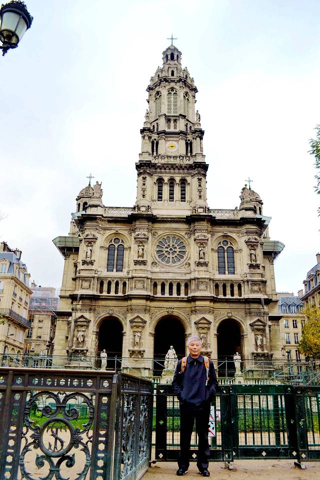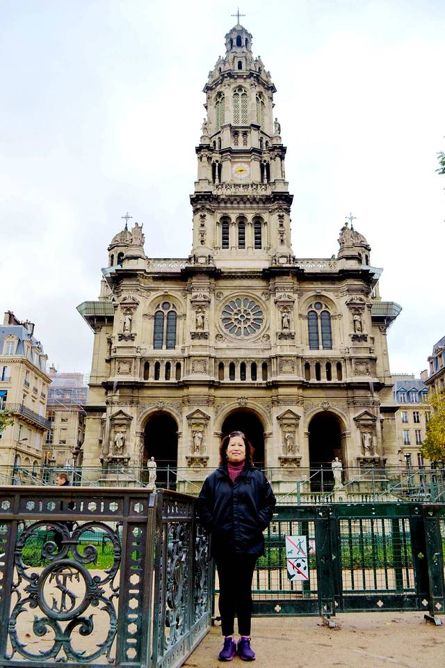 巴黎天主圣三教堂是一座巴洛克风格的塔状建筑,规则对称,高耸的钟楼顶端高高耸立着威严的十字架,钟楼内有罗马大钟。教堂顶部有瞭望台,四角立着精美的雕塑。教堂立面的中部是巨大的玫瑰花窗。玩得累了,我们和成都的2位姑娘一起坐在教堂的花园里面休息一会儿。
