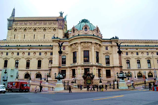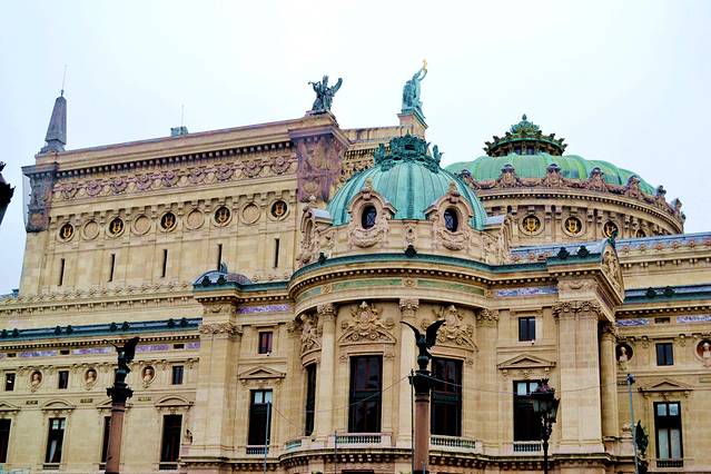 巴黎歌剧院建于1875年,由查尔斯·加尼叶设计,因此也叫加尼叶歌剧院。这座规模宏大、金碧辉煌的歌剧院是拿破仑三世时期的典型建筑之一,正面外墙布满了大量的装饰物,内部装潢更是豪华,四壁和廊柱布满巴洛克式的雕像、挂灯、绘画等,就像是个装满了金银珠宝的首饰盒。这也是著名电影和音乐剧《歌剧魅影》的原型。
