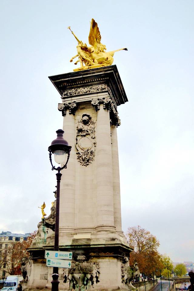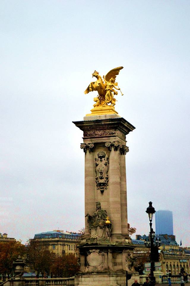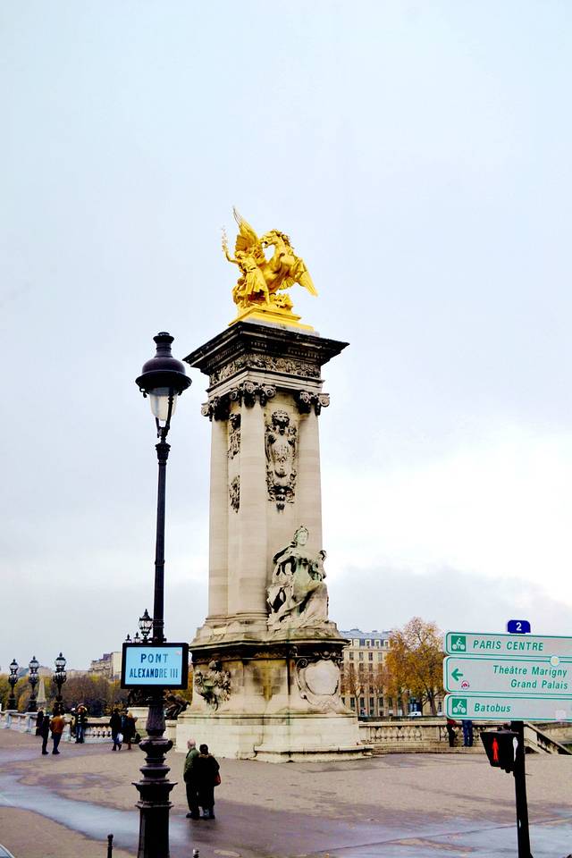 这是从河上看亚历山大三世桥的两端各有两座高17米的桥塔,塔顶有象征科学、艺术、工业与商业的四组金色的骏马雕塑,飞马振翼欲扬,造型非常生动。它们即使在阴雨的天气里也都金光闪闪,富丽堂皇。因此,这里也被人们认为是巴黎最华丽的桥。另外,大桥的桥身上有32座四周环绕着神态各异的小天使的雕塑灯架,里面包含了很多来源于水上世界的装饰物。