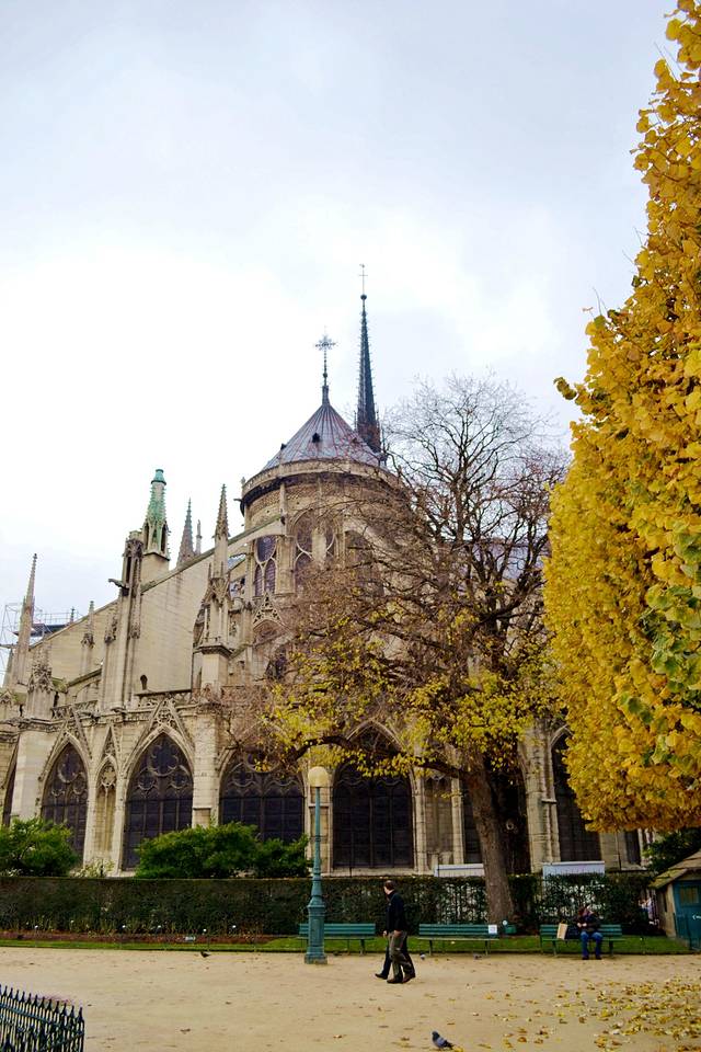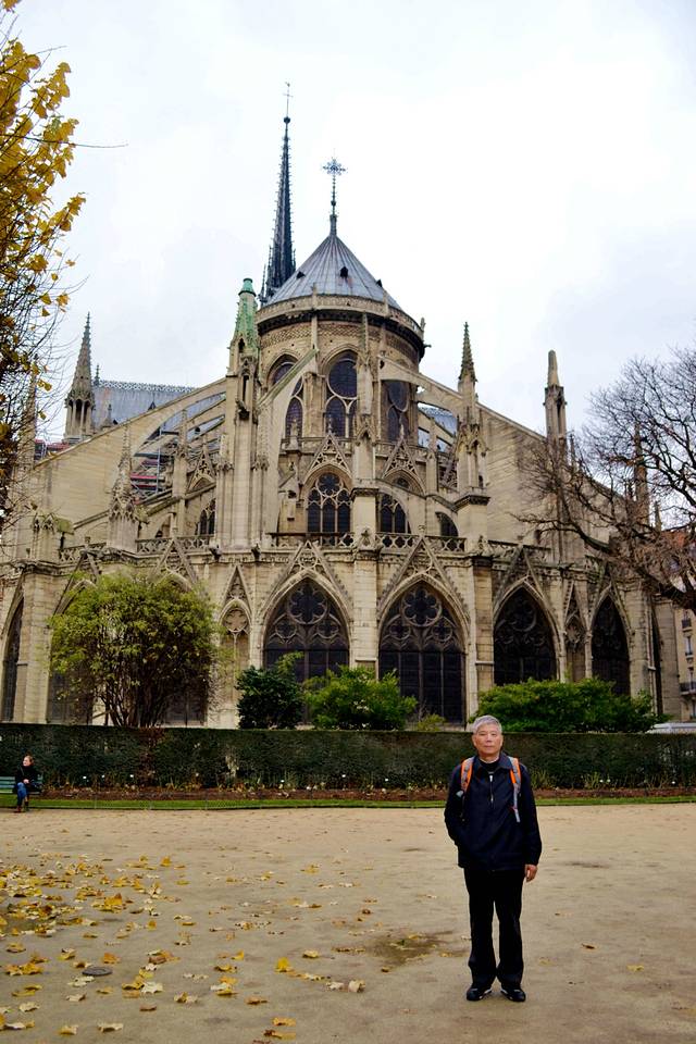 塞纳河对岸的巴黎市政厅则与圣母院隔河相望。圣母院前广场上,搭起了通道和高高的看台,台阶上始终坐满了人,欣赏自由艺人的表演。圣母院后方的小花园里经常有巴黎当地人拍婚纱照。这里就是巴黎圣母院里面的小花园。我们今天自由活动,自己吃午餐。我们就在这里买了点牛奶,三明治,坐在长椅上吃饭。