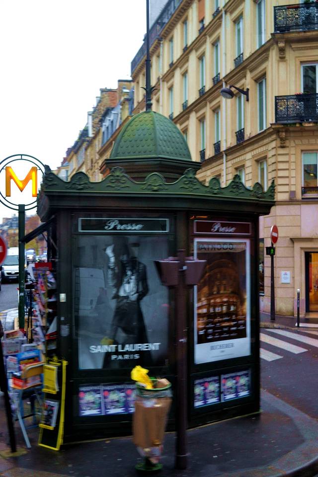 这是巴黎地铁的标志M。同时也是书报亭。