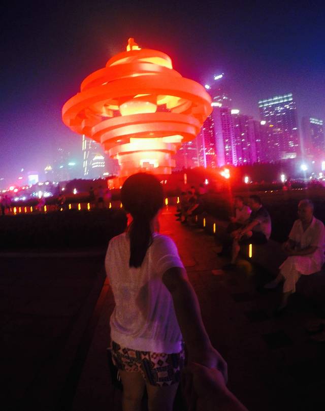 吃饱喝足沿着海岸线走去五四广场,有点像晚上的深圳湾,只是沿路很多小摊贩,空气非常好,很凉爽。走去五四广场发现了一群气势很强的暴走族,队伍非常壮大,把广场包围着暴走,应该是这里变相的广场舞罢。五四广场拍照很好看。一天的行程也就在这里结束了。