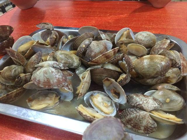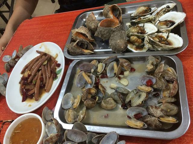 只求味道,不求填饱的排骨是满足不了我们的,再加上早餐还是一顿肯德基,让渴望吃海鲜的我们已经按耐不住,立马杀到营口市场买海鲜去了。走过加工店,本想随口问问加工费,货比三家再挑选。谁知这一问热心的加工的老板娘一路随我们到市场买海鲜,还帮我们讲价,这待遇让我想起在三亚的第一顿,也是这么被敲诈的。不过幸好这个老板娘还是很好,人也漂亮,虽很希望我们多吃点,但是也是尊重我们的意见,加工价后来听打车师傅说是公道价。海鲜很便宜,已经蛤蜊7块,大海螺6个26,海肠20块一斤。四个菜,加上加工费一共80多,由于都是非常新鲜的海鲜,所以海鲜味道偏咸,跟广东的口味不一样,真的是要配上一杯啤酒才过瘾。我们两个吃完一致认为海鲜非常好吃,就是加工师傅做得口味不太好,还不如我们自己加工。所以建议加工也要找有口碑的啤酒屋加工才好,要不就浪费了食材。吃完已经两点了,我们打了快车回酒店放东西。