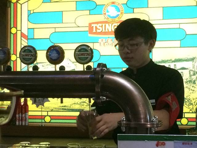 说回博物馆,这酿酒的技术还是德据时期,酒鬼们受不了,把他引进青岛,只是这里的小麦不一样,大致是经过糖化,去糖化,发酵,低温酵化,最后净化变成清澈的啤酒。所谓的原浆是没有净化,里面含有丰富的酵母,营养成分较高,但是浓度更高,一份啤酒下去就真的会有点昏,特别那时候是中午一点,姐不喜欢喝啤姐,觉得又苦又涩。但这里的原浆啤酒确实顺口清爽,陪着啤酒豆,很快咕噜咕噜地就喝完了,可能因为他够冰凉,但喝得快,真容易醉。比较有趣的是醉酒小屋,进去感觉真的里面有另外的引力牵引你无法直线行驶,而且是喝完原浆之后,更感觉醉了。最近在博物馆有个大餐厅,还有一杯纯生啤酒。喝完我们就去觅食了。