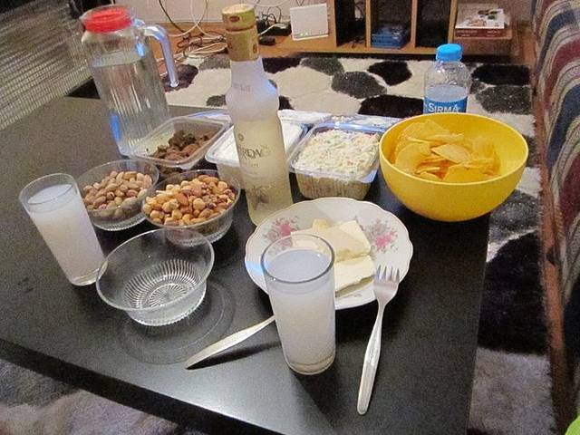 Raki,薯片,花生,榛子,sheese,salad,土耳其式对酌。