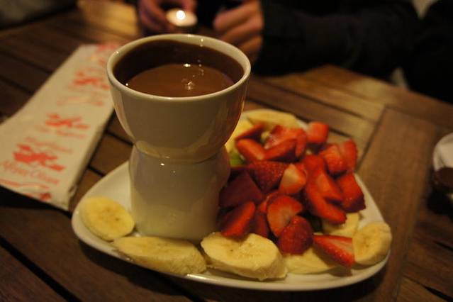 巧克力fondue(瑞士火锅的叫法),把香蕉和草莓丢进去涮,好有圣诞气息~
