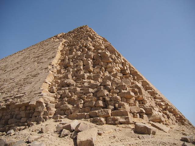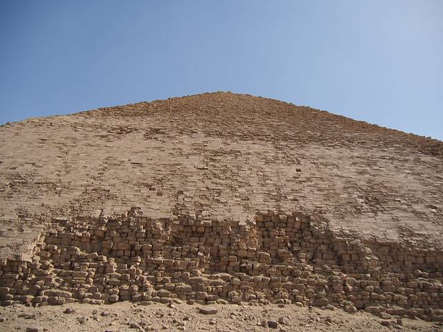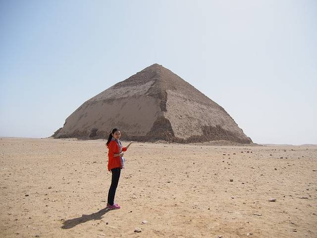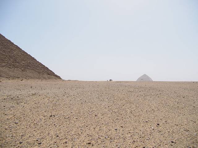 弯曲金字塔(Bent Pyramid)一开始是以斜角52度建造,造到一半建筑师们觉得以这个角度造下去墓室会承受不住压力,结果只能中途改为43度建造完工,是个失败之作,法老斯尼夫鲁就在北边以43度角重新造了新的金字塔,就是红色金字塔