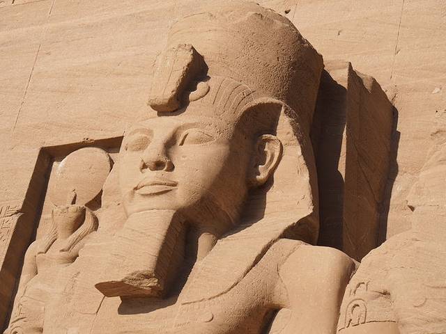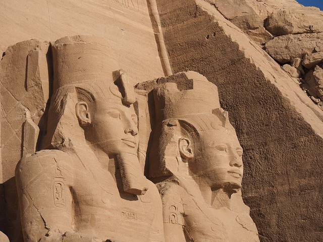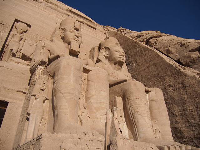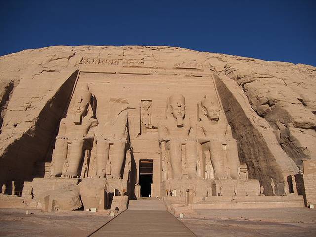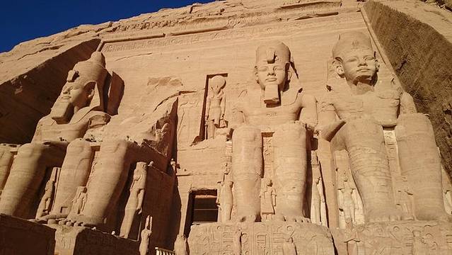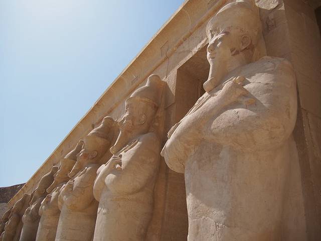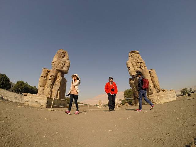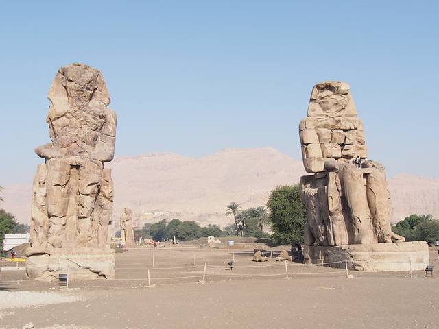 门农巨像(The Colossi of Memnon):阿梅诺菲斯三世神庙的遗产(约公元前1391年--公元前1353年间)这两尊独块巨石雕像曾经位于阿梅诺菲斯三世神庙的第一塔门之前,这座神庙曾经是底比斯范围内最大的神庙,传说比卡纳克神庙的规模更大,但是建造者们犯了一个愚蠢的错误,过于靠近尼罗河,导致神庙被每年的洪水逐渐侵蚀掉了,剩下的这两尊巨像在公元前一次地震中开裂,每天早晨随着气温的升高,会发出一种类似歌唱的声音,古希腊人认为这是特洛伊战争中被阿喀琉斯杀死的门农的声音(这什么逻辑。。),从此“门农”便成了两尊巨像的名字,直到后来,罗马皇帝命人修复了石像,结果石像再也不能发出声音了目测基座有2米,高大概接近20米