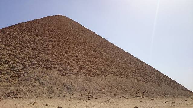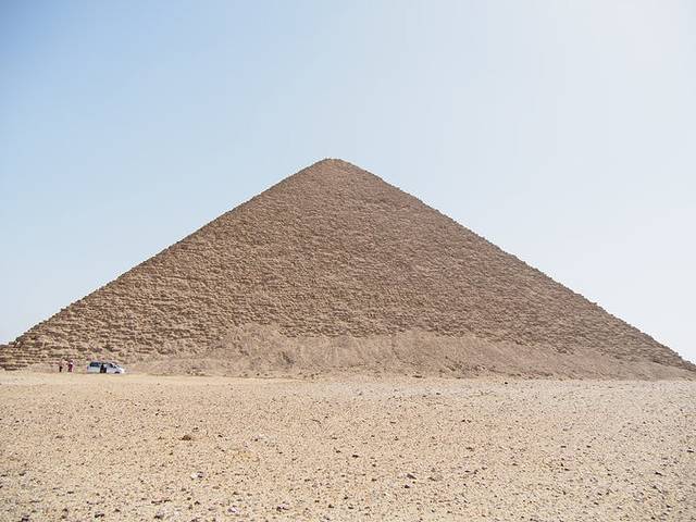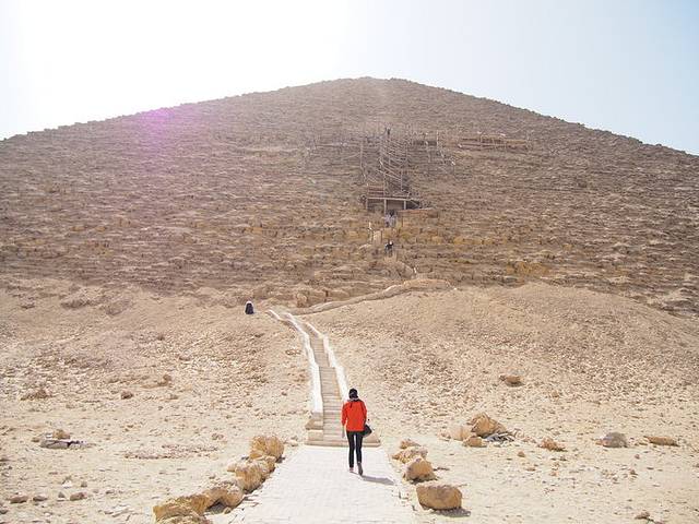 代赫舒尔(Dahshur)红色金字塔和弯曲金字塔都在这个区域,都大约建于第四王朝法老斯尼夫鲁(胡夫他爹)统治时期(公元前2613年--公元前2589年),弯曲金字塔是红色金字塔的“试作型”,红色金字塔是世界上第一座真金字塔,埃及第三大金字塔,仅次于吉萨的胡夫金字塔和哈夫拉金字塔红色金字塔(Red Pyramid),斜角43度,与弯曲金字塔上半部分相同,因为石材呈红色而被叫做红色金字塔,不过我们靠近看并没有觉得颜色很红