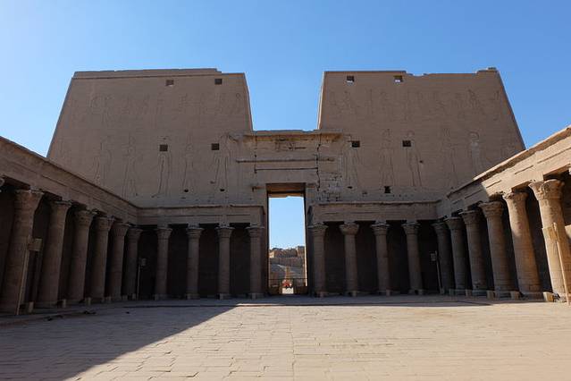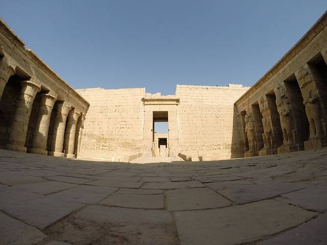 第一庭院,左边是纸莎草状立柱,右边是奥西里斯立柱,前方就是第二道门