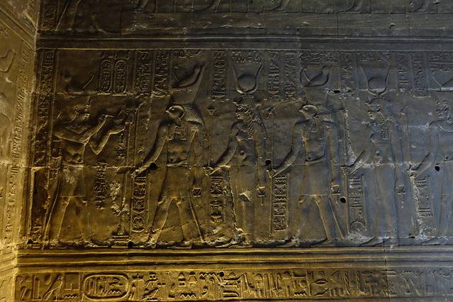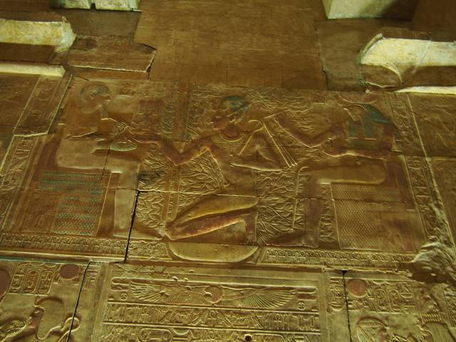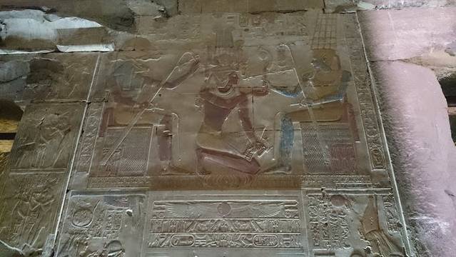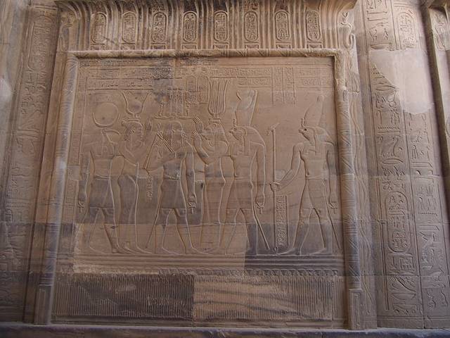 大门上端的浮雕,中间是女神伊西斯,右边的尼罗河女神手持莲花,代表上埃及,左边的尼罗河女神手持纸莎草,代表下埃及