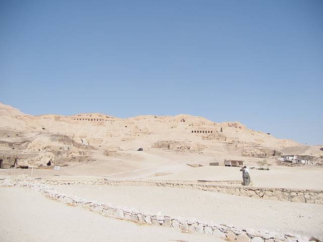 贵族墓(Tombs of the Nobles):生活化的墓葬底比斯的这片私人墓地现在被称为贵族墓,其实里面不光是一些有点身份人的墓地,也有平民的墓地,陵墓大部分都装饰过,壁画都是表现日常生活和葬礼仪式等,基本上都是第18王朝时候的(约公元前1550年-公元前1295年)我们看的一组三个分别是:TT52----Nakht,图特摩斯四世期间的钦天监TT69----Menna,图特摩斯四世期间的国土局长TT41----Amenemipet ,拉美西斯一世和塞提一世时期阿蒙神的祭司好像,这个墓开出来才2年据说里面都是不能拍照的,但是墓的管理员说给他钱就可以拍,我们当然不会屈服,不能拍就不拍走的时候外面随便拍了下,贵族墓的样子就是这样一座小土山