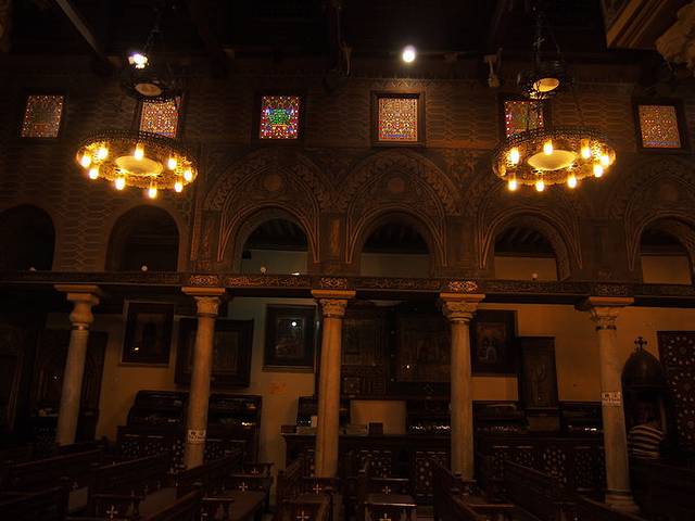 悬空教堂(Hanging Church)又名圣母玛利亚教堂,之所以称之悬空,只是因为是建立在以前的巴比伦要塞南门的上面,教堂里边还可以看见下方要塞的遗址,可能建于教宗依撒格(公元690年-692年)任期内,后又被重建过多次,目前的地面已经比罗马时代抬高了6米,需要经由29级台阶才能登上教堂,所有也有人叫它阶梯教堂庭院中的壁画