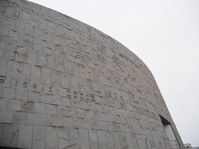 新馆最著名的两个特征,一个是主楼外墙上雕刻着50种世界各地古老文字和符号,可以看到中文的“类”字和“化”字