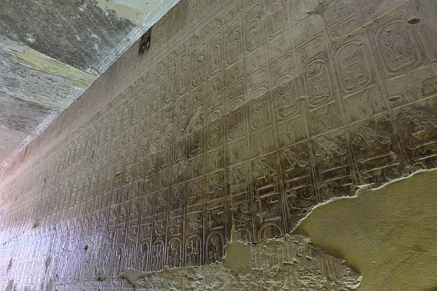 这样对比一下就知道门有多大啦~~~~全长63米~~~雕刻(本来写的是浮雕,经版主指正这里的都是凹雕)上画的是拉美西斯三世处死俘虏献给阿蒙神的场景