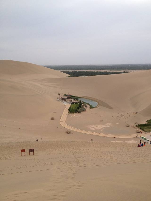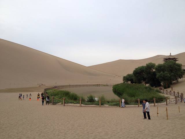 月牙泉就在鸣沙山中 四周都是大沙漠 偏偏在中间生出一弯月牙泉 而且沙子是不会把水覆盖掉的!据说白天的时候 沙子从高坡滑下 但是到了晚上风又把沙子吹上去了
