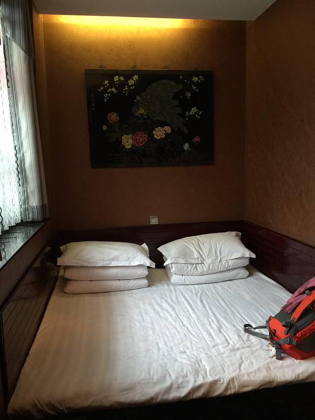 这是我很喜欢的土炕,一面窗,一面墙,墙上有挂画。可是真的好冰凉,就像冰箱一样,我们用体温把炕捂热了。