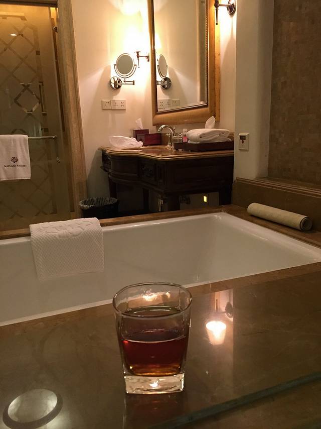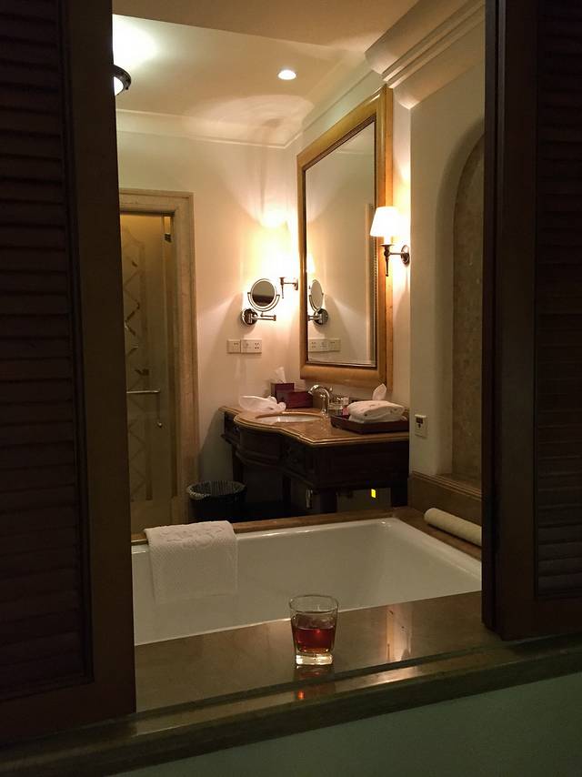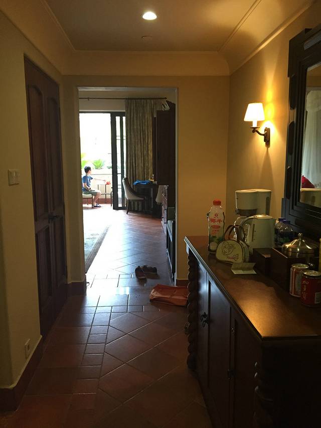 大堂所在层是6F,5F是温泉和泳池等康体娱乐中心,3F、4F、6F、7F都有客房(住得越高景观越好),2F和1F是设备层及停车场。我们住在3F,一进房间觉得有霉味,放下行李第一时间打开阳台落地窗。双人房间有45平米左右,检查所有房间配置的正常使用后,发现这里比其他酒店多了个非常好用的抽湿机,一会儿霉味便无存。哦,还有贴心地配了蚊帐,这比很多酒店配备的电热防蚊灯有用安全多了。浴室墙上开了百叶窗,可以泡着浴缸看房间的电视,浴缸不算大,勉强可供一大一小共浴。如果配有一次性浴缸膜、擦背的水瓜络、泡澡专用泡泡就更好了。