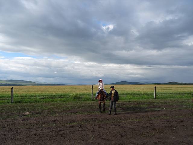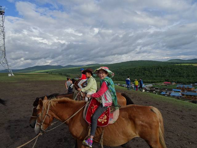 赶往临江的路上,我们一直在企盼天晴,想去南山看日落,谁知天公不作美,到日落时分下起大雨,计划泡汤。好在在天黑前天又放晴了,活动走起。先去北山骑慢马,这是大家起的名,说这边马不跑只爬山,就叫慢马了,其实对像我这种第一次骑马的人来说也很刺激了。爬个小山,每人50,老板娘人不错,还送了免费挤牛奶,当然,这也是史师傅交涉的成果。