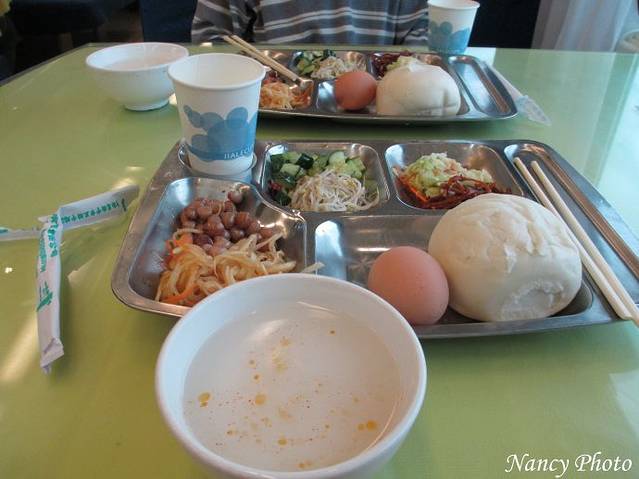 早餐每人25元,一杯牛奶(奶粉泡的)、一个水煮鸡蛋、一个馒头,一些小菜,很稀的白粥任意吃。昨晚吃得少,现在有食欲了,喝粥吃蛋,有精神了。
