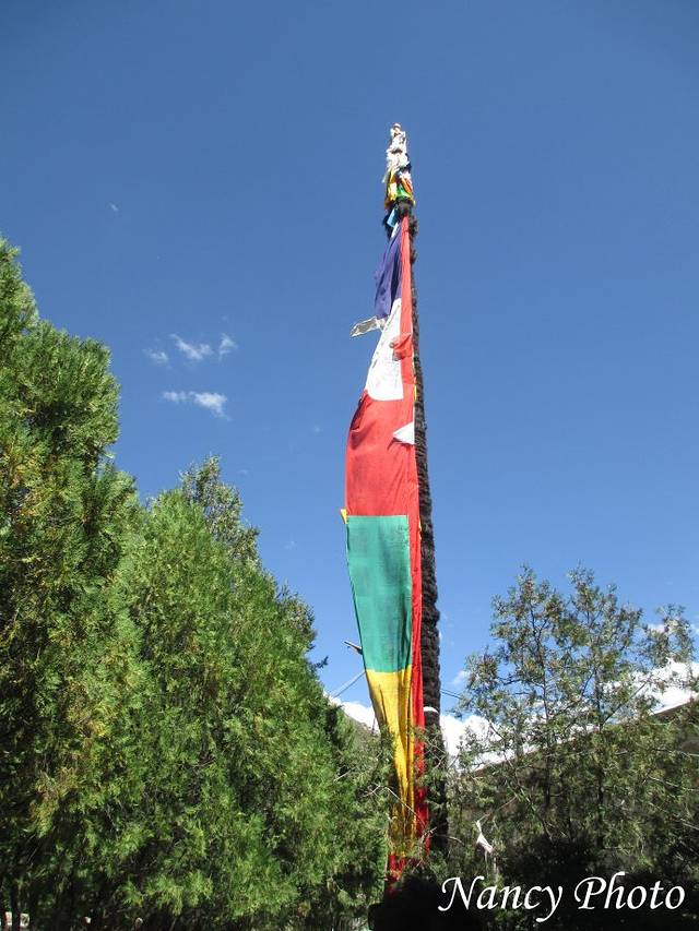 舒适的大房间,一面墙是镜子,房间看起来更大。看窗外酒店的院子里挂满经幡。