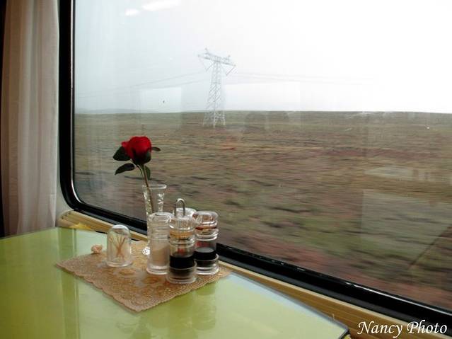 餐桌上还摆着一支玫瑰花。此时正在经过海拔5000米的唐古拉山高原,服务员说过一会就会经过唐古拉山山口,过了山口就是西藏地区了。行驶在5000米高度,好像没啥感觉,除了蹲厕所有点头晕。