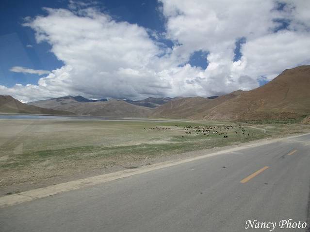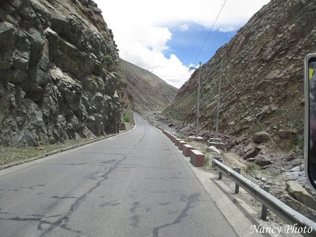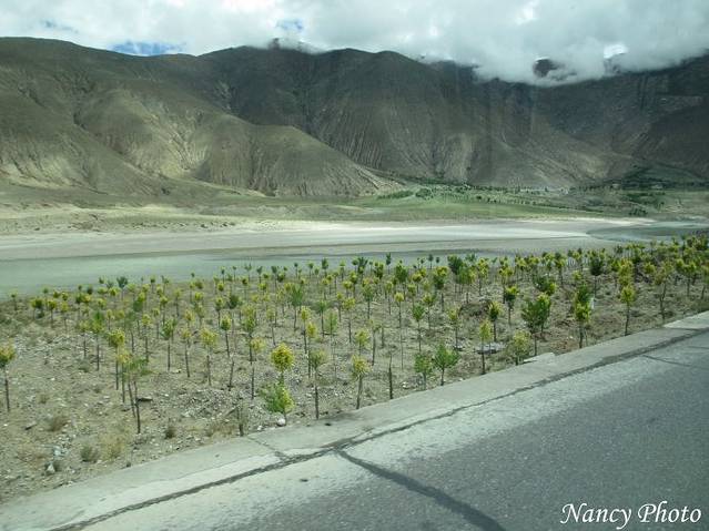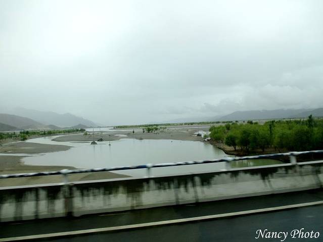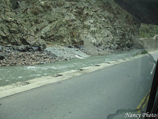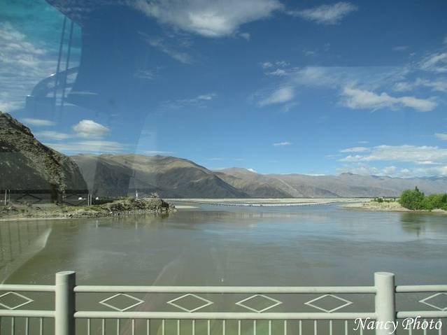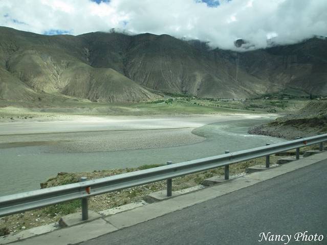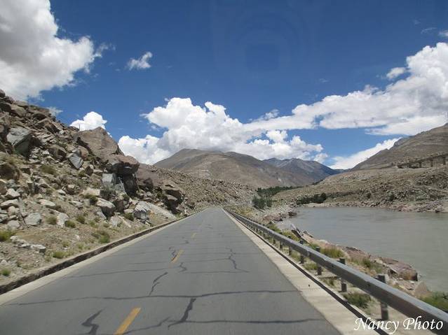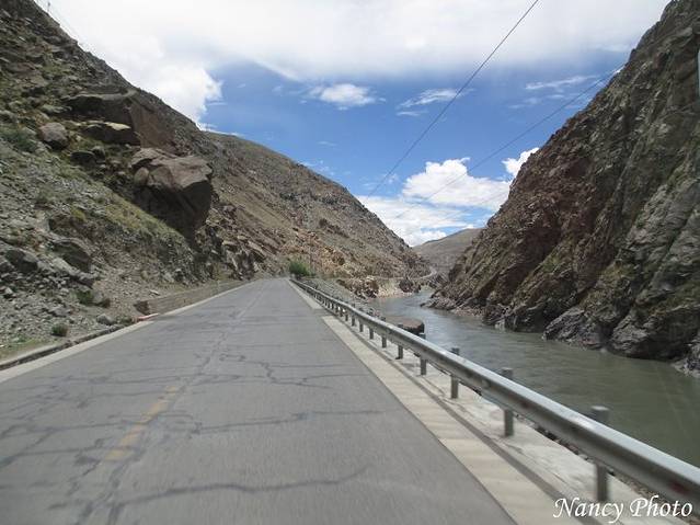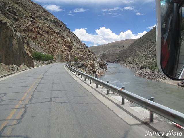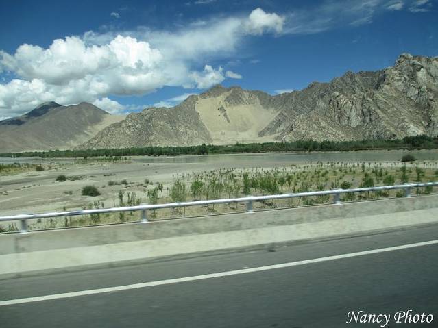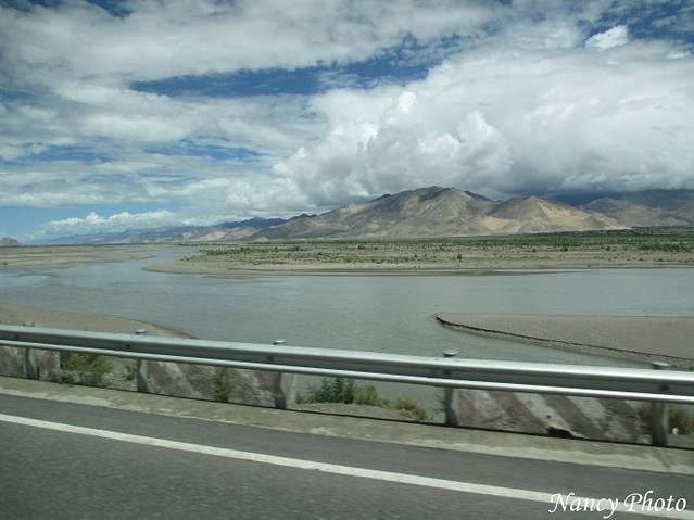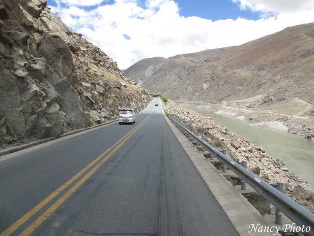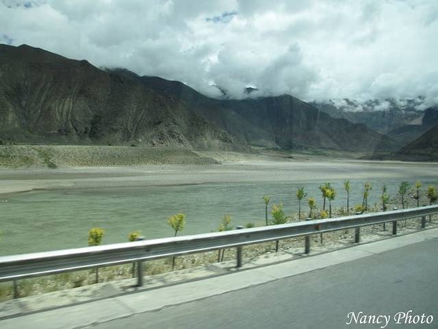沿着雅鲁藏布江岸行驶。雅鲁藏布江源于喜马拉雅山脉,是世界上最高的河流,平均海拔3000米以上。