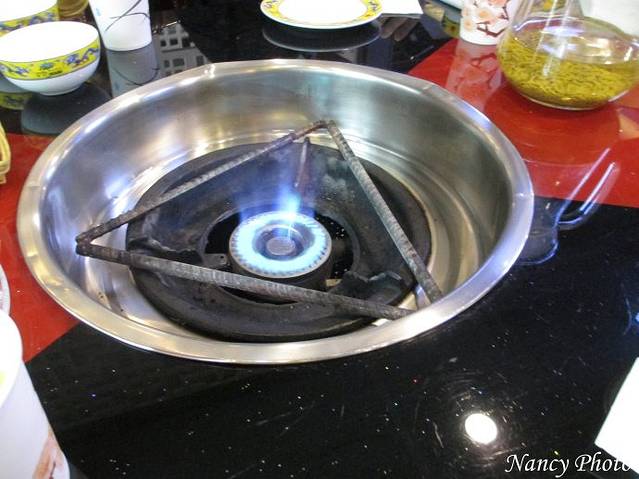 6点多,抵达石锅鸡餐厅。这是放石锅的炉子,还要一个三脚架才能承受得住那么重的石锅。