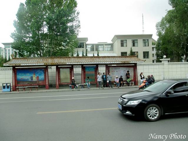 4点半返回酒店,稍作休息后前往餐厅。在车上见到整洁干净的拉萨街道、公交车站。