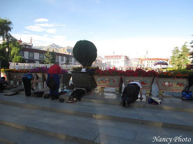 酒店外面是步行街,走5分钟就到大昭寺的广场。晚上8点半,还有不少人在广场外做等身磕头。天还这么亮,当时怎么就不懂得走进去大昭寺广场呢