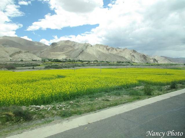 青藏公路边是大面积的油菜花,开得黄灿灿的。以前在电视上看过“环青海湖国际公路自行车赛”的画面真美,今天我来了,却是雨天太遗憾了。