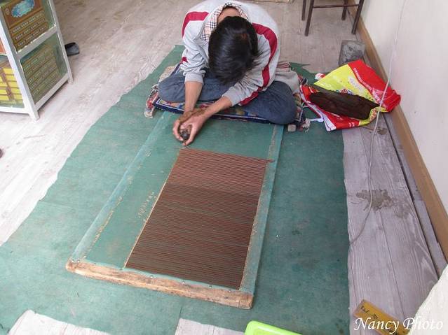 超过限速时间,只能停车在此等候,路边商店里藏族小伙子在手工制作藏香,一根根非常均匀
