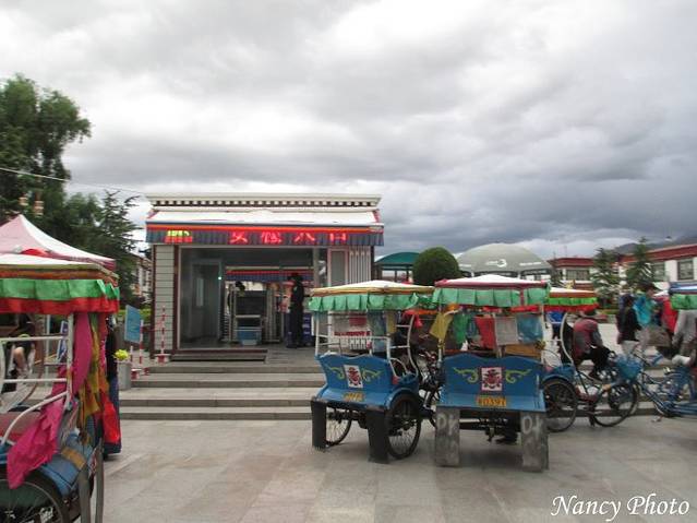 早上10:30集合前往参观著名的大昭寺。住的唐卡酒店就在大昭寺附近,走路几分钟就到了八角街广场。进入广场随身携带的包要过安检,这是过安检的入口处。