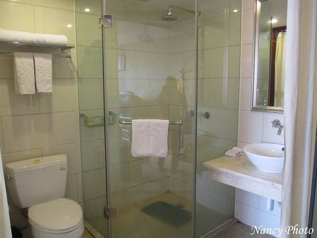 卫生间是全玻璃加布帘。导游交代到拉萨的第一天不要洗澡,怕感冒,据说在西藏得感冒不容易好。结果我们还是洗澡了,当然动作要快一些,不要受凉。在火车上窝了一天,不洗澡难受。换下的T恤衫、袜子洗好晾在卫生间,晚餐回来就干了,可见拉萨多干燥。