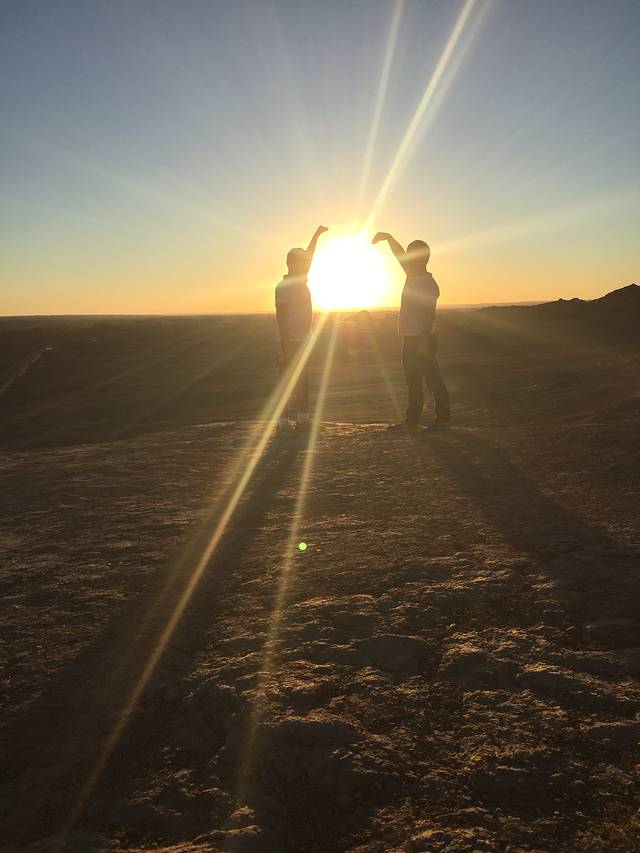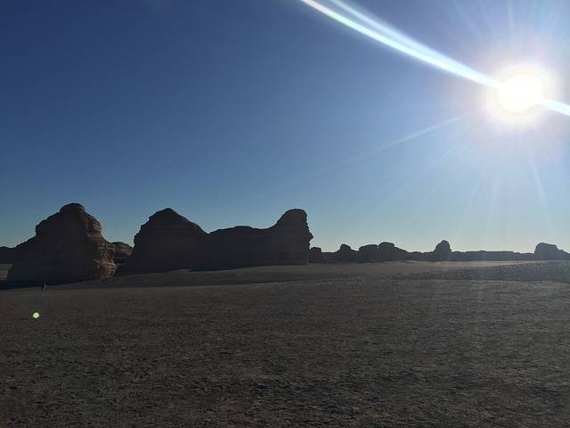 敦煌日落要比北京晚2小时左右,八点的天空依然明亮。随手抓拍,这张太巧了,透过疾驰的越野车后窗(还可以看得到玻璃反光)拍公路时,太阳刚好被路牌挡住,完全是无心之作,美景也需偶遇