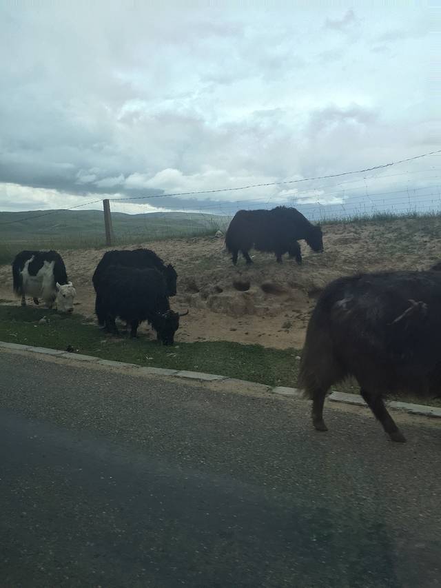 牦牛横穿马路,开车师傅说,这一带要十分小心,如果不小心撞上了牦牛,是要赔死的,因为当地牧民十分不讲理,他们除了跟你算这头牛的价格,还会算上牦牛生小牛,再生小牛等等,不配个十来万是走不掉的,民风也比较彪悍。