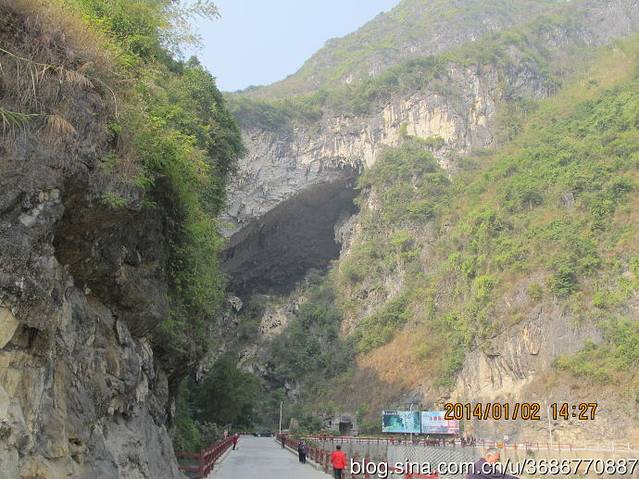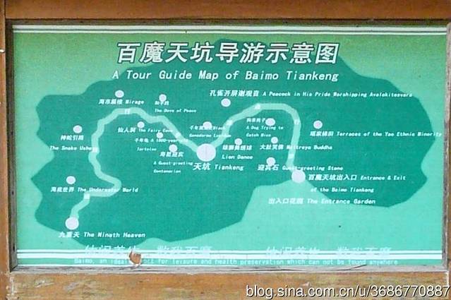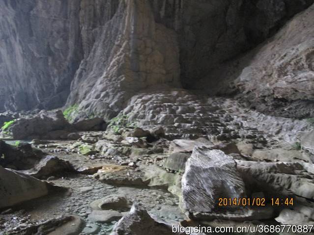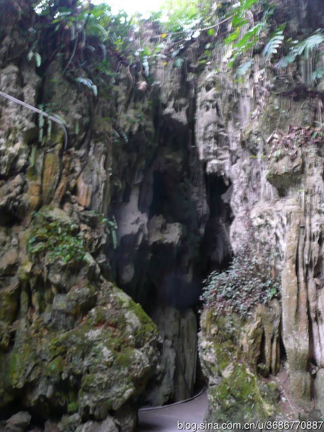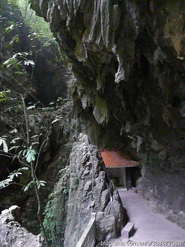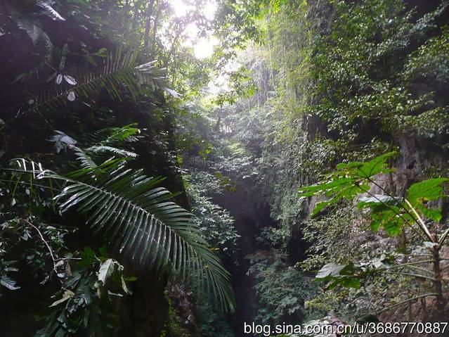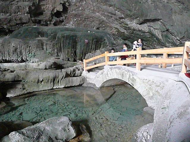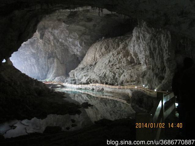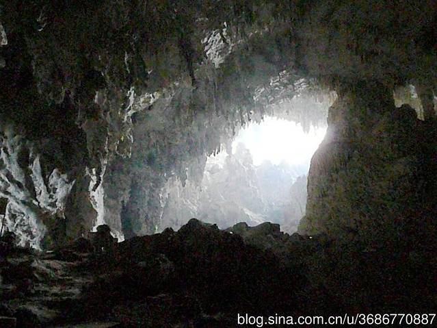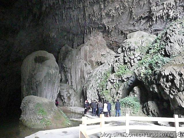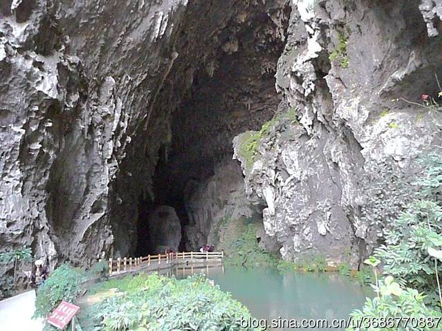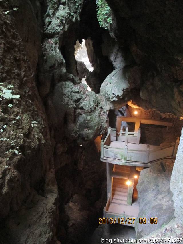 继续前行,迎面一堵绝壁挡住去路,近看却有个洞口。入洞后,竟是一个高100米、宽60米的宽敞的溶洞。深深的洞底水流潺潺,洞顶呈一线天,洞壁及洞顶布满各种造型奇异的钟乳石,从Z字形的云梯下到洞底