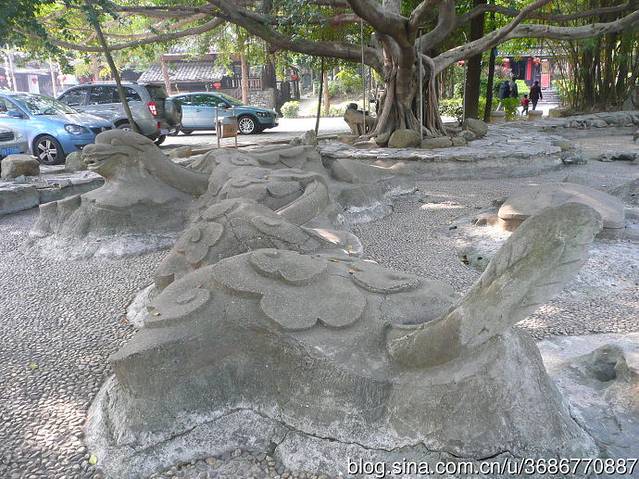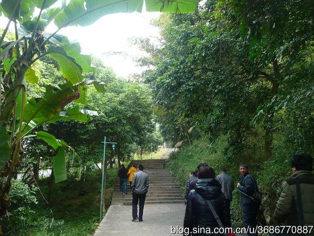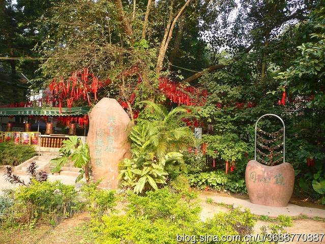 绕回石台阶大道,石阶两旁,是一排排高大的细叶树。这些树是相思树,果实大小如豆,色泽艳红,叫相思豆,也称红豆。唐代著名诗人王维赋诗赞叹红豆:“红豆生南国,春来发几枝?愿君多采撷,此物最相思。”花开时节,这里一片火红。红豆熟了,落满一地,您可捧回满满一怀的相思。
