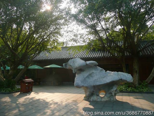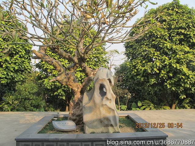 廊间展示广西各族人民的生产、生活的摄影作品和东盟各国具有代表性的建筑、服饰、饮食等图片资料。图为廊外的异石.