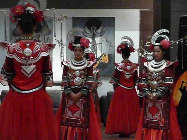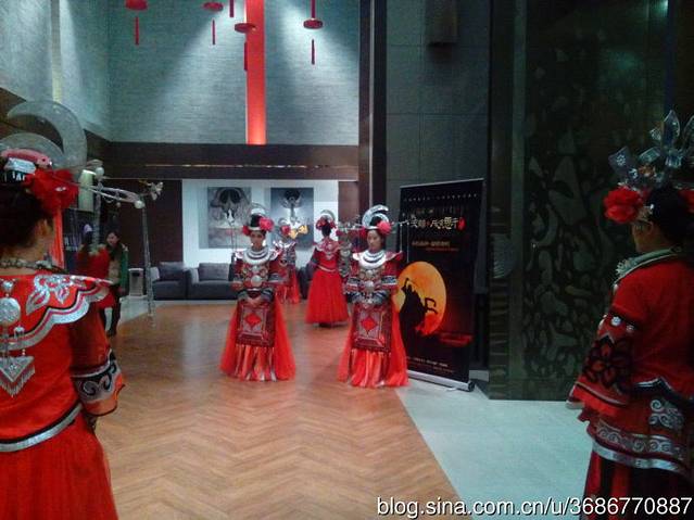 开演前,身着艳丽民族服装的美女在门厅迎客