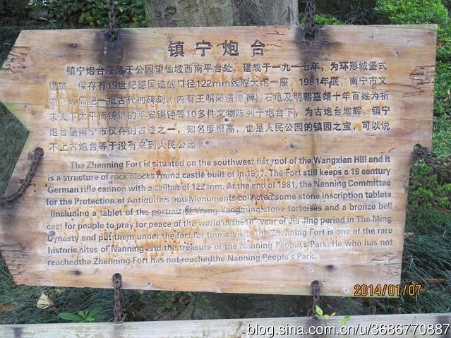 镇宁炮台位于人民公园内望仙坡。由炮台、铁炮及围墙三部分构成。1917年9月,两广巡阅使陆荣廷为扼守南宁,下令拆除六公祠,筑起炮台,从龙州县平公岭上运回一门铁炮架于台上,工程于次年7月竣工,命名为“镇宁炮台”。