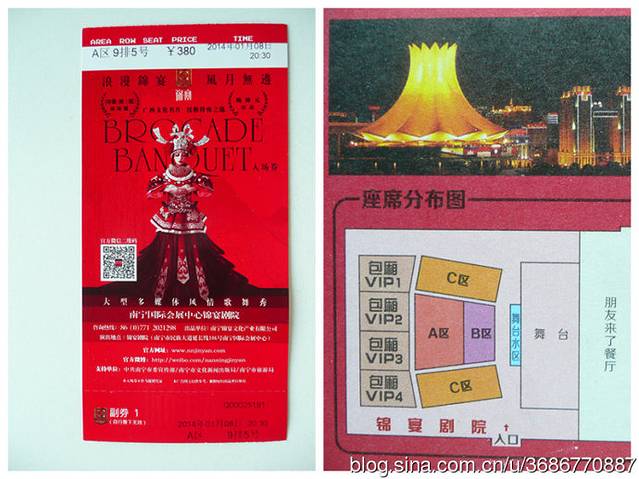 我们这次广西游的压轴重戏,就是观看大型多媒体风情歌舞秀《锦宴》。当我们向表妹说出这个想法时,立即得到她的热烈支持:看过《锦宴》,很好。过后送我们两张入场券。