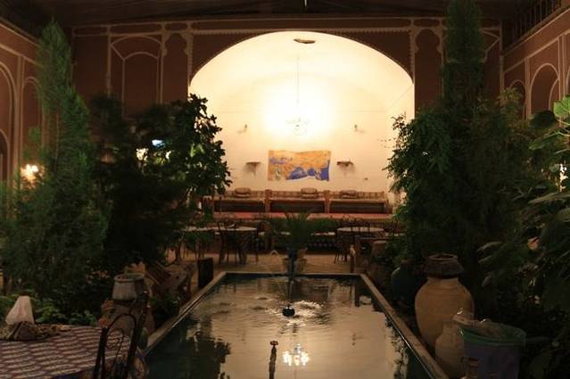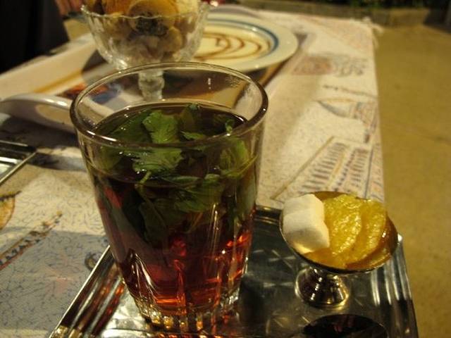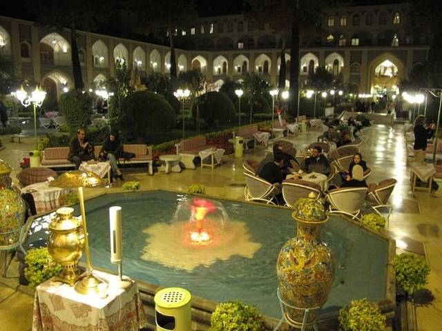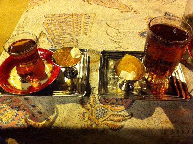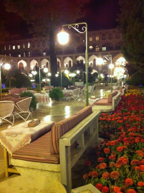 由于5点多就天黑,夜晚显得有点漫长。在河边喝完石榴汁,我们决定再打车去阿巴斯酒店的庭院餐厅喝茶吃宵夜。虽然阿巴斯酒店的名头很响,花园餐厅也非常漂亮,但东西都很便宜,我们点了很多的茶和点心,舒舒服服地窝在户外沙发上,喝喝茶聊聊天,骂骂昨天晚上那个混蛋,不知不觉就晚上10点多了。